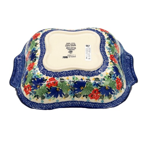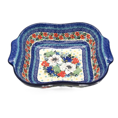 Miska o wymiarach 24,5x28,0 cm wykonana z ceramiki bolesławieckiej to idealne połączenie tradycji i uroku. Zdobiona dekoracją unikatową, charakteryzuje się wysoką jakością wykonania i pięknymi zdobieniami przedstawiającymi motyw kwiatowy. Wzory te w odcieniach niebieskiego, zielonego iczerwonego , ręcznie malowane przy użyciu charakterystycznej techniki stempelkowej oraz pędzla są doskonale wkomponowane w tło, typowe dla ceramiki z Bolesławca.
