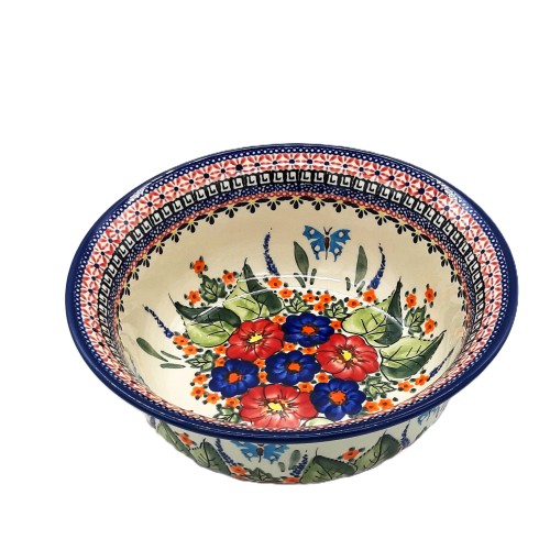 Miska z ceramiki Bolesławiec o pojemności 2,0 l w dekoracji ART149 to naczynie, które łączy w sobie tradycję i funkcjonalność. Wykonana ręcznie z trwałej ceramiki, ozdobiona jest wzorem w odcieniach wielobarwnych z kwiatowym motywem, charakterystycznym dla stylu bolesławieckiego. Miska o pojemności 2 litrów jest idealna do serwowania sałatek, zup lub innych potraw, a jednocześnie stanowi piękną ozdobę kuchni.