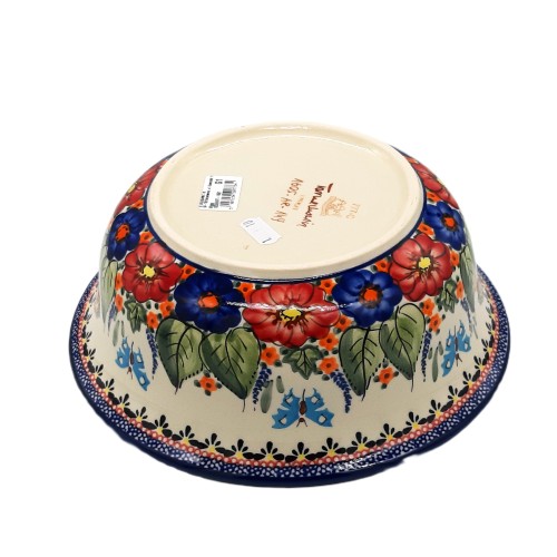 - Kolorami: Główna paleta barw to głęboki błękit , czerwień i zieleń. To połączenie kolorów jest bardzo charakterystyczne dla ceramiki bolesławieckiej i nadaje misce wyjątkowego uroku.