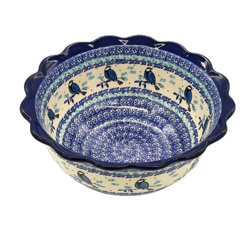 Największą ozdobą są jednak ptaszki w odcieniach niebieskiego i czerni, siedzące na gałązkach – motyw dodaje naczyniu lekkości i naturalnego charakteru. Krawędź miski zdobi granatowy, falowany rant, który pięknie podkreśla formę i kontrastuje z jasnym tłem.