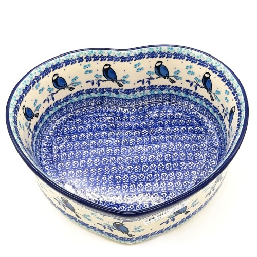 Piękna i wyjątkowa miska w kształcie serca z ceramiki bolesławieckiej, ręcznie malowana z motywem niebieskich ptaków. To idealny sposób na dodanie odrobiny miłości i koloru do Twojego domu.