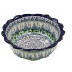 Ta miska ceramiczna z Bolesławca została ozdobiona uroczą dekoracją w odcieniach błękitu i zieleni. Na kremowym tle widoczne są delikatne kwiatuszki i drobne listki, tworzące pasy okalające całość naczynia. Krawędź miski zdobi granatowy, falowany rant, który pięknie podkreśla formę i kontrastuje z jasnym tłem.