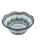Miska zdobiona jest motywem roślinnym w odcieniach niebieskiego i zieleni na kremowym tle. Obrzeże oraz wnętrze pokryte są charakterystycznym, gęstym wzorem w odcieniach granatu, co nadaje naczyniu wyjątkowy, folkowy charakter.
