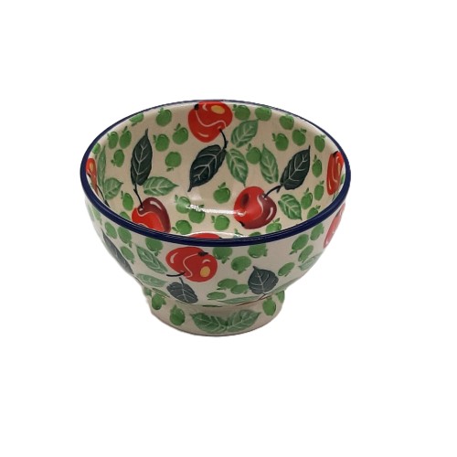 Urocza miseczka ceramiczna na stopce wykonana ręcznie przez Spółdzielnię Rękodzieła Artystycznego w Bolesławcu. Ręcznie malowana w wyjątkowy wzór z motywem jabłek i liści, łączy w sobie tradycję bolesławieckiego rzemiosła z nowoczesnym stylem użytkowym. Idealna do podawania deserów, przekąsek, płatków śniadaniowych lub lodów.