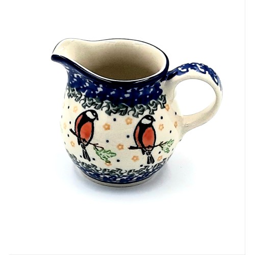 Ten mlecznik z ceramiki Bolesławiec o pojemności 0,15 litra wyróżnia się subtelnym wzorem z gilami w odcieniach czerwonych i niebieskich barw. Brzeg mlecznika wykończony jest w charakterystycznym dla bolesławieckiej ceramiki ciemnoniebieskim kolorze. Mlecznik ma zaokrąglony kształt i wygodny uchwyt, co sprawia, że jest praktycznym i eleganckim dodatkiem do serwowania mleka lub śmietanki.