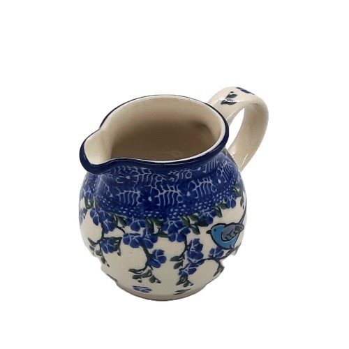 Ten mlecznik z ceramiki Bolesławiec o pojemności 0,15 litra wyróżnia się subtelnym wzorem roślinnym z elementem ptaszka w odcieniach niebieskiego. Mlecznik ma zaokrąglony kształt i wygodny uchwyt, co sprawia, że jest praktycznym i eleganckim dodatkiem do serwowania mleka lub śmietanki.
