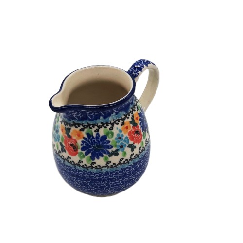 Ten dzbanek z ceramiki Bolesławiec o pojemności 0,35 litra wyróżnia się subtelnym wzorem kwiatowym w odcieniach wielobarwnych. Dzbanek ma zaokrąglony kształt i wygodny uchwyt, co sprawia, że jest praktycznym i eleganckim dodatkiem do serwowania mleka lub soku.