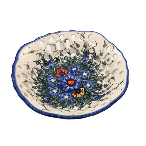 Ażurowa owocarka ceramiczna z Bolesławca o średnicy 22,5 cm to elegancki i funkcjonalny element dekoracyjny oraz użytkowy. Charakteryzuje się misternie wykonanym ażurowym wzorem z motywami kwiatowymi oraz trawką, które nadają jej lekkości i wyjątkowego stylu. Wzór kwiatów został wykonany z precyzją, co podkreśla kunszt tradycyjnego rzemiosła Bolesławca. Ceramika jest wykończona ręcznie i pokryta typowym dla Bolesławca szkliwem, które nadaje jej trwałości i pięknego połysku. Doskonale sprawdzi się jako naczynie na owoce, a także jako dekoracja na stole czy półce, dodając uroku wnętrzom w stylu klasycznym, rustykalnym lub folkowym.
