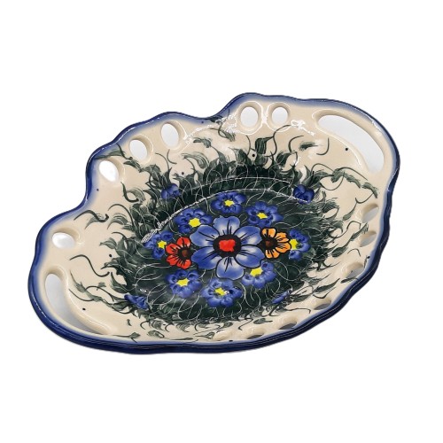 Owalna owocarka ażurowa z ceramiki bolesławieckiej o wymiarach 26 x 20,5 cm to wyjątkowy przykład tradycyjnego, ręcznie malowanego rzemiosła. Ażurowe wycięcia tworzą elegancki, lekki efekt, nadając misie dekoracyjny charakter i stylową formę. Zdobiona jest motywem kwiatowym z trawką typowym dla ceramiki z Bolesławca – wzorem pełnym detali, najczęściej w kolorach czerwonym, niebieskim, białym i zielonym, charakterystycznych dla tej manufaktury. Szkliwiona powierzchnia nadaje owocarce gładkość i trwałość, sprawiając, że jest nie tylko piękną ozdobą, ale i praktycznym naczyniem do serwowania owoców lub słodyczy.