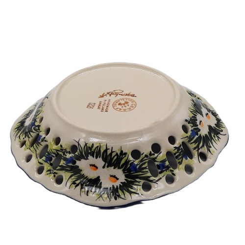 Ażurowa owocarka ceramiczna z Bolesławca o średnicy 22,5 cm to elegancki i funkcjonalny element dekoracyjny oraz użytkowy. Charakteryzuje się misternie wykonanym ażurowym wzorem z motywami kwiatowymi , które nadają jej lekkości i wyjątkowego stylu. Wzór kwiatów został wykonany z precyzją, co podkreśla kunszt tradycyjnego rzemiosła Bolesławca. Ceramika jest wykończona ręcznie i pokryta typowym dla Bolesławca szkliwem, które nadaje jej trwałości i pięknego połysku. Doskonale sprawdzi się jako naczynie na owoce, a także jako dekoracja na stole czy półce, dodając uroku wnętrzom w stylu klasycznym, rustykalnym lub folkowym.