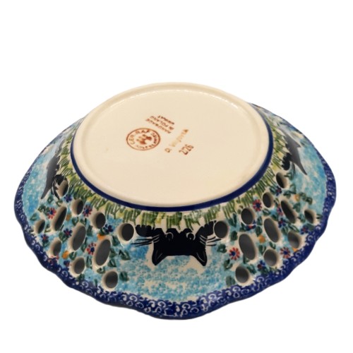 Ażurowa owocarka ceramiczna z Bolesławca o średnicy 22,5 cm to elegancki i funkcjonalny element dekoracyjny oraz użytkowy. Charakteryzuje się misternie wykonanym ażurowym wzorem z motywem kotków , który nadają jej lekkości i wyjątkowego stylu. Wzór ten został wykonany z precyzją, co podkreśla kunszt tradycyjnego rzemiosła Bolesławca. Ceramika jest wykończona ręcznie i pokryta typowym dla Bolesławca szkliwem, które nadaje jej trwałości i pięknego połysku. Doskonale sprawdzi się jako naczynie na owoce, a także jako dekoracja na stole czy półce, dodając uroku wnętrzom w stylu klasycznym, rustykalnym lub folkowym.