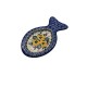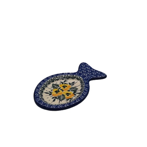 Ta mała, ceramiczna podstawka w kształcie ryby zdobiona jest motywem z bratkami w odcieniach żółtego i niebieskiego.  Kompaktowy rozmiar potrawy sprawia, że idealnie nadaje się do serwowania małych przystawek, trzymania przypraw, na ości lub jako element dekoracyjny.
