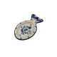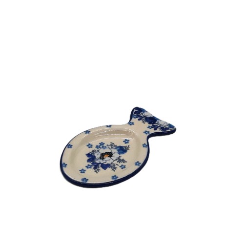 Ta mała, ceramiczna podstawka w kształcie ryby zdobiona jest motywem kwiatowym w odcieniach niebieskiego.  Kompaktowy rozmiar potrawy sprawia, że idealnie nadaje się do serwowania małych przystawek, trzymania przypraw, na ości lub jako element dekoracyjny.