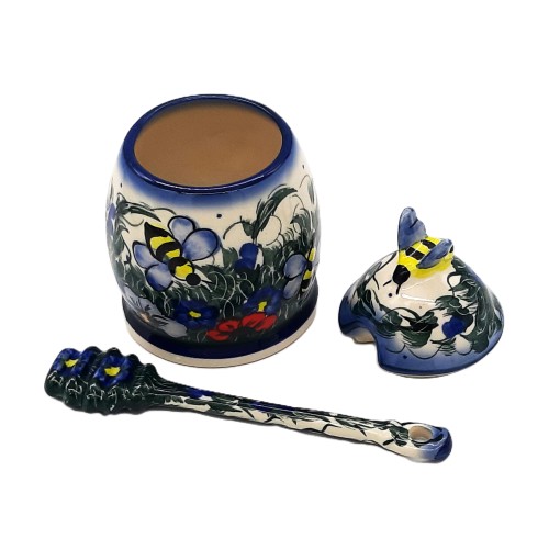Pojemnik na miód, wykonany jest z trwałej ceramiki bolesławieckiej- kamionki. Ma wysokość 13,0 cm i pojemność 0,25 litra. Charakterystyczne dla ceramiki bolesławieckiej są ręcznie malowane wzory, często inspirowane motywami roślinnymi, co widać również w tym przypadku — dekoracje przedstawiają różnorodne kwiaty w odcieniach niebieskiego, zieleni i innych delikatnych kolorach. Na szczycie pokrywki znajduje się mała pszczółka, co doskonale wpisuje się w przeznaczenie pojemnika.