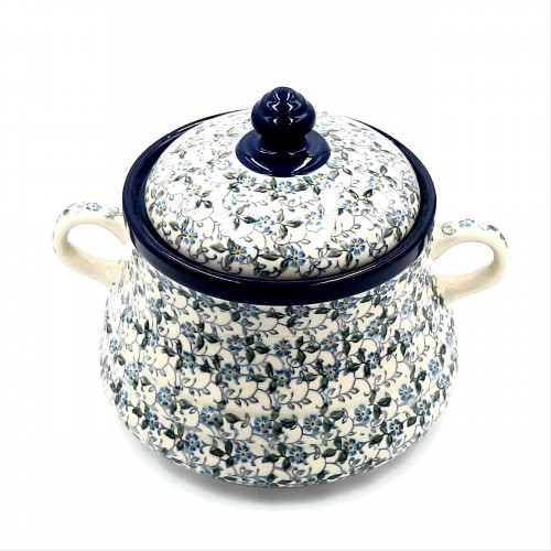 Ceramiczny garnek o pojemności 2 litrów wykonany z ceramiki bolesławieckiej, idealny do przygotowywania potraw takich jak bigos, leczo czy zupy. Wyróżnia się eleganckim i tradycyjnym wzornictwem, charakterystycznym dla bolesławieckiej ceramiki, z motywem małych kwiatuszków.
