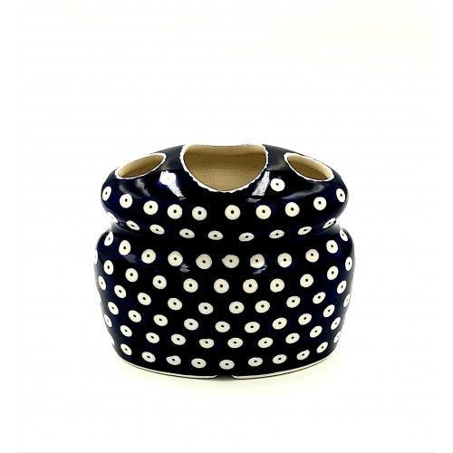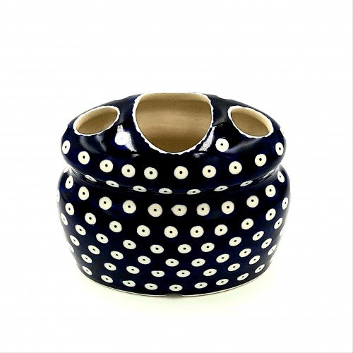 Pojemnik na szczoteczki i pastę wykonany z ceramiki bolesławieckiej- kamionki . Jest to tradycyjna polska ceramika, znana z ręcznego malowania i zdobienia. Pojemnik został ozdobiony wzorem o nazwie dek.42, który charakteryzuje się granatowym tłem z białymi kropkami przypominającymi oko. Tego typu wzory są typowe dla ceramiki z Bolesławca, cieszącej się popularnością zarówno w Polsce, jak i za granicą, ze względu na swoją unikalną estetykę i wysoką jakość wykonania.