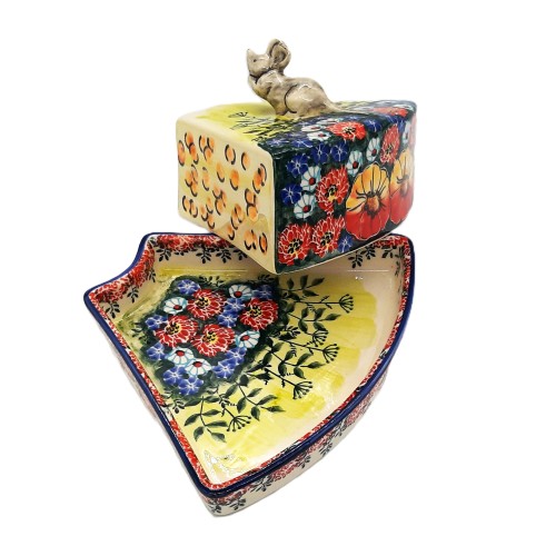 Pojemnik ma dekoracyjny wygląd, przypominający kawałek sera z dziurkami, a na jego pokrywie znajduje się figurka myszy. Całość ozdobiona jest charakterystycznym bolesławieckim wzorem kwiatowym  w odcieniach wielobarwnych. Dodatkowo pojemnik stoi na ozdobnej podstawie z wyprofilowanymi krawędziami. Podstawę, również zdobi wzór kwiatowy z trawką.