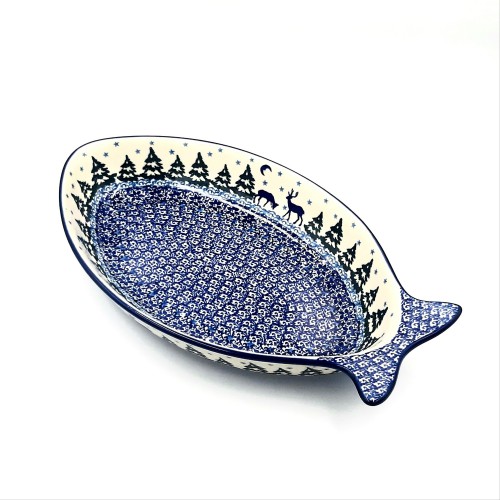 Półmisek w kształcie ryby o wymiarach 34 x 19,5 cm i wysokości 5 cm, wykonany z ceramiki Bolesławiec, to wyjątkowe naczynie w dekoracji świątecznej. Jego kształt ryby nawiązuje do tradycji wigilijnych i może być idealnym dodatkiem do serwowania świątecznych dań, takich jak ryba po grecku czy karp. Charakterystyczna dla ceramiki Bolesławiec dekoracja to ręcznie malowane wzory, które mogą przedstawiać świąteczne motywy – choinki, gwiazdy, śnieżynki lub inne symbole Bożego Narodzenia – w typowej dla Bolesławca palecie kolorystycznej: granat, kobalt, biel i akcenty czerwieni. Szkliwiona powierzchnia nadaje mu połysk, a solidne wykonanie gwarantuje trwałość i odporność na wysokie temperatury.