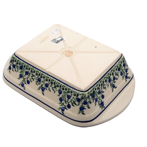 - Wzór: Półmisek zdobią delikatne, ręcznie malowane borówki na gałązkach, które tworzą elegancki i ponadczasowy wzór.