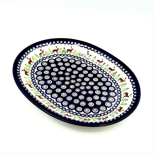 Półmisek na potrawy z ceramiki bolesławieckiej o wymiarach 26,7 x 34,0 cm to wyjątkowe naczynie do serwowania różnych dań, takich jak wędliny, sery, przystawki czy sałatki. Wykonany ręcznie, z motywem reniferów, łączy w sobie tradycję i elegancję. Ceramika ta jest zdobiona często w odcieniach niebieskiego co nadaje jej unikalny i stylowy wygląd. Półmisek jest nie tylko funkcjonalny, ale także stanowi ozdobę stołu. Dzięki wysokiej jakości materiałom, ceramika bolesławiecka jest odporna na wysokie temperatury i łatwa w utrzymaniu czystości.
