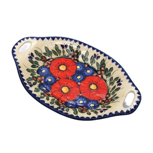 - Wzór:Półmisek zdobi piękny, ręcznie malowany wzór przedstawiając kwiaty . Dominują kolory czerwony i niebieski, które tworzą żywą i energetyczną kompozycję.