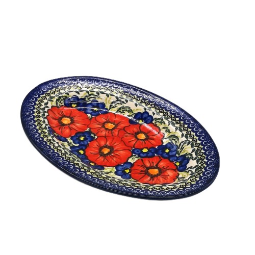 - Wzór:Półmisek zdobi piękny, ręcznie malowany wzór przedstawiający czerwone i niebieskie kwiaty. Dominują kolory zielony, czerwony i niebieski, które tworzą żywą i energetyczną kompozycję.