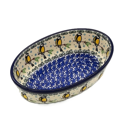 Motyw żółtych ptaszków, który zdobi półmisek, dodaje mu uroku i wprowadza do wnętrza przyjemny, naturalny akcent. Kolory i wzory charakterystyczne dla ceramiki bolesławieckiej są w odcieniach niebieskiego i żółtego co sprawia, że każdy egzemplarz jest unikatowy. Półmisek nie tylko świetnie prezentuje się na stole, ale także doskonale sprawdza się w piekarniku, dzięki wysokiej odporności ceramiki na działanie wysokich temperatur.