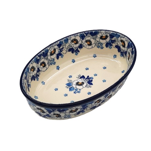 Motyw kwiatowy, który zdobi półmisek, dodaje mu uroku i wprowadza do wnętrza przyjemny, naturalny akcent. Kolory i wzory charakterystyczne dla ceramiki bolesławieckiej są w odcieniach niebieskiego co sprawia, że każdy egzemplarz jest unikatowy. Półmisek nie tylko świetnie prezentuje się na stole, ale także doskonale sprawdza się w piekarniku, dzięki wysokiej odporności ceramiki na działanie wysokich temperatur.