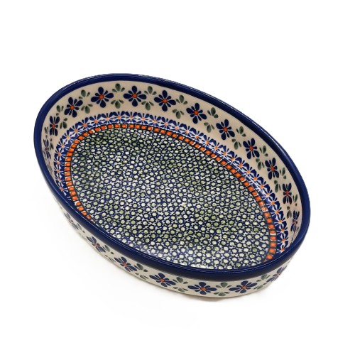- Wzór: ręcznie malowany wzór DU60, charakteryzujący się motywem geometrycznym oraz kwiatuszki, które nadają półmiskowi wyjątkowego charakteru.