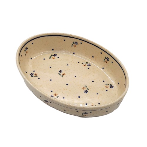 Na zdjęciu widoczna jest półmisek do zapiekania o wymiarach 14,2 x 20,2 cm cm i wysokości 4,8 cm, wykonana z ceramiki bolesławieckiej. Naczynie jest ozdobione ręcznie malowanym motywem w dekoracji 111, co nadaje mu radosny, rustykalny charakter.