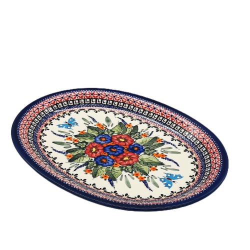 Półmisek na potrawy z ceramiki bolesławieckiej o wymiarach 22,1 x 29,1 cm to wyjątkowe naczynie do serwowania różnych dań, takich jak wędliny, sery, przystawki czy sałatki. Wykonany ręcznie, z charakterystycznym dla Bolesławca wzorem, łączy w sobie tradycję i elegancję. Ceramika ta jest zdobiona naturalnymi motywami, często w odcieniach wielobarwnych co nadaje jej unikalny i stylowy wygląd. Półmisek jest nie tylko funkcjonalny, ale także stanowi ozdobę stołu. Dzięki wysokiej jakości materiałom, ceramika bolesławiecka jest odporna na wysokie temperatury i łatwa w utrzymaniu czystości.