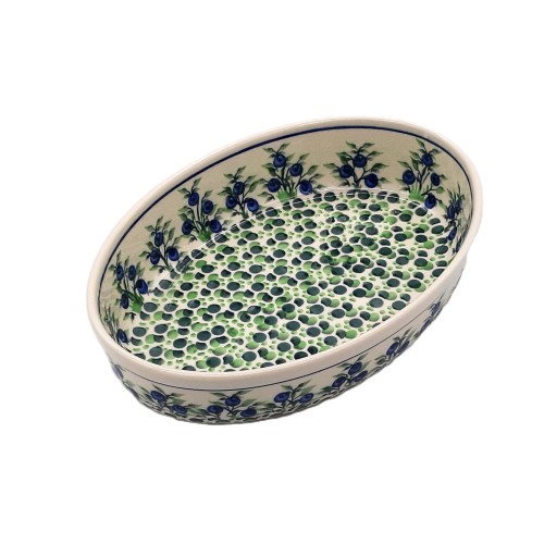 Na zdjęciu widoczna jest półmisek do zapiekania o wymiarach 17,0 x 24,0 cm cm i wysokości 5,0 cm, wykonana z ceramiki bolesławieckiej. Naczynie jest ozdobione ręcznie malowanym motywem w dekoracji 1208, co nadaje mu radosny, rustykalny charakter.
