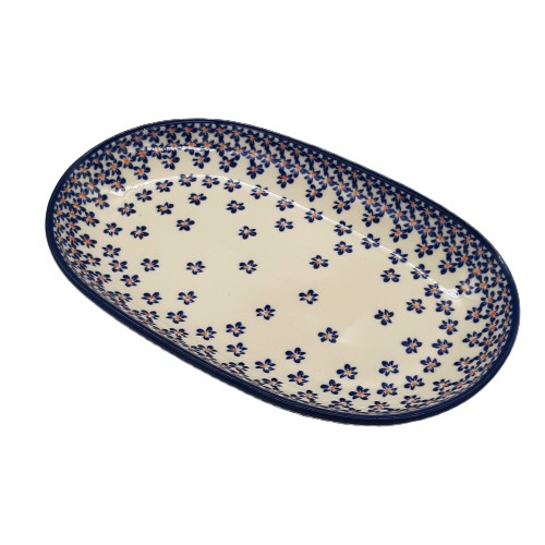 Półmisek na wędliny i sery z dekoracją 882A wykonany z ceramiki bolesławieckiej to idealny dodatek do serwowania potraw na różnego rodzaju spotkaniach czy przyjęciach. Ceramika bolesławiecka słynie z wysokiej jakości i charakterystycznych wzorów, a dekoracja w drobne kwiatuszki dodaje uroku i oryginalności temu produktowi. Wymiary półmiska 27,5x17,0 zapewniają odpowiednią przestrzeń na serwowane potrawy, a wzór nadaje mu unikalnego wyglądu, który z pewnością przyciągnie uwagę gości.