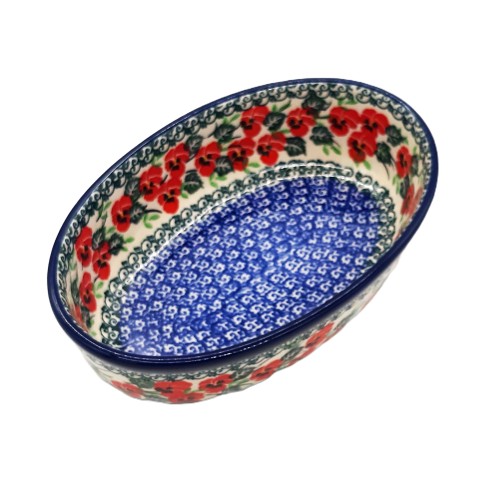 Półmisek do zapiekania z ceramiki bolesławieckiej to elegancki i funkcjonalny element kuchennego wyposażenia. Jego wymiary wynoszą 21 cm długości, 13,5 cm szerokości oraz 5,5 cm wysokości, co sprawia, że idealnie nadaje się do przygotowywania i serwowania różnorodnych potraw.