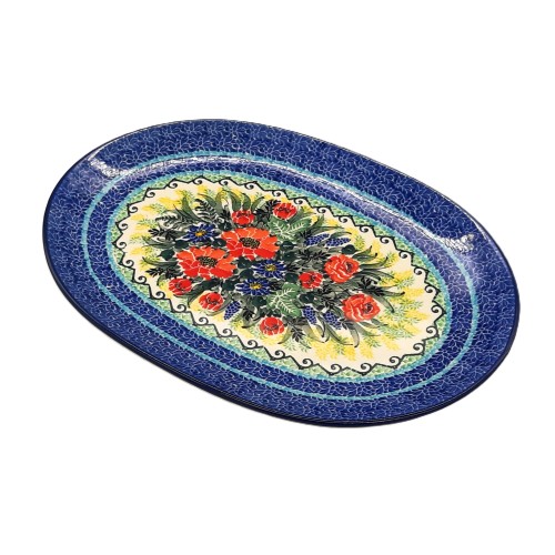 Półmisek na potrawy z motywem kwiatowym wykonany z ceramiki bolesławieckiej to idealny dodatek do serwowania potraw na różnego rodzaju spotkaniach czy przyjęciach. Ceramika bolesławiecka słynie z wysokiej jakości i charakterystycznych wzorów, a dekoracja unikatowa dodaje uroku i oryginalności temu produktowi. Wymiary półmiska  zapewniają odpowiednią przestrzeń na serwowane potrawy.