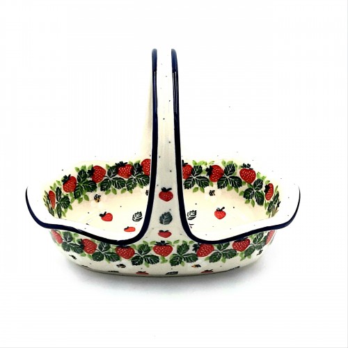 Ten uroczy koszyk z motywem poziomek to doskonałe połączenie funkcjonalności i piękna tradycyjnej ceramiki Bolesławiec. Wykonany z solidnej i trwałej ceramiki zachwyca swoją elegancją i wyjątkowym wzornictwem. Jego delikatna forma jest ozdobiona ręcznie malowanymi poziomkami, które dodają mu niepowtarzalnego uroku. Jego kolorowe motywy poziomek i charakterystyczny styl ceramiki Bolesławca sprawiają, że jest on niezwykle atrakcyjny wizualnie, przyciągając spojrzenia i dodając świeżości każdemu wnętrzu.