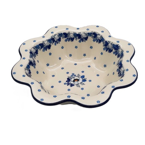 Przedstawiona salaterka to niezwykłe połączenie funkcjonalności i estetyki, pochodzące ze Spółdzielni Rękodzieła Artystycznego w Bolesławcu. Jej wyjątkowy kształt kwiatu i ręcznie malowany wzór sprawiają, że jest to prawdziwa perełka wśród naczyń ceramicznych.