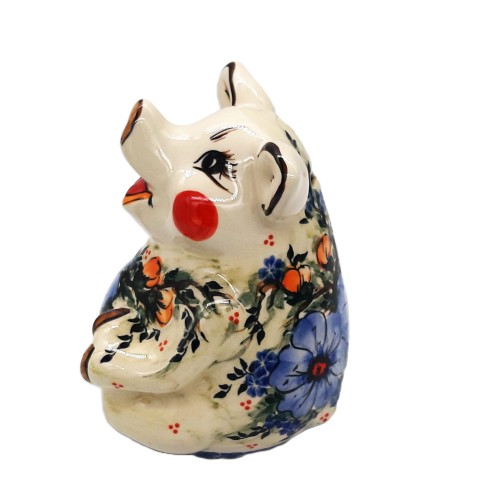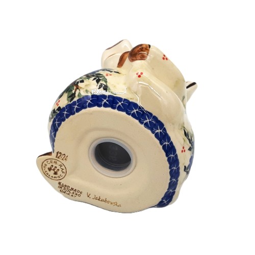 Skarbonka w kształcie świnki, wykonana z tradycyjnej ceramiki bolesławieckiej, o wysokości 17,5 cm. Zdobiona ręcznie malowanymi motywami kwiatowymi w odcieniach zieleni i niebieskiego, charakterystycznymi dla stylu bolesławieckiego. Pod spodem znajduje się korek umożliwiający łatwe wyjmowanie oszczędności. Produkt łączy funkcjonalność z estetyką, stanowiąc praktyczny i dekoracyjny element wnętrza, idealny na prezent lub do kolekcji ceramiki użytkowej.