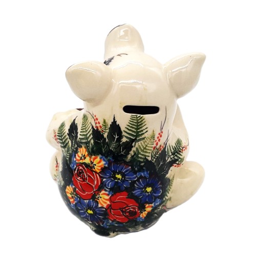 Skarbonka w kształcie świnki, wykonana z tradycyjnej ceramiki bolesławieckiej, o wysokości 17,5 cm. Zdobiona ręcznie malowanymi motywami kwiatowymi w odcieniach czerwieni i niebieskiego, charakterystycznymi dla stylu bolesławieckiego. Pod spodem znajduje się korek umożliwiający łatwe wyjmowanie oszczędności. Produkt łączy funkcjonalność z estetyką, stanowiąc praktyczny i dekoracyjny element wnętrza, idealny na prezent lub do kolekcji ceramiki użytkowej.