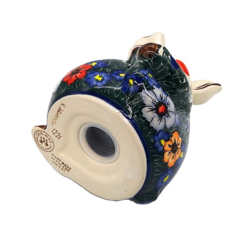 Skarbonka w kształcie świnki, wykonana z tradycyjnej ceramiki bolesławieckiej, o wysokości 17,5 cm. Zdobiona ręcznie malowanymi motywami kwiatowymi oraz trawką w żywych kolorach w odcieniach zieleni,czerwieni,niebieskiego, charakterystycznymi dla stylu bolesławieckiego. Pod spodem znajduje się korek umożliwiający łatwe wyjmowanie oszczędności. Produkt łączy funkcjonalność z estetyką, stanowiąc praktyczny i dekoracyjny element wnętrza, idealny na prezent lub do kolekcji ceramiki użytkowej.