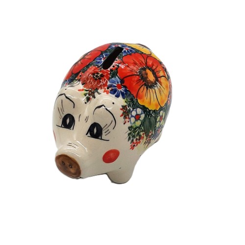 Skarbonka w kształcie świnki, wykonana z tradycyjnej ceramiki bolesławieckiej, o wysokości 11 cm. Zdobiona ręcznie malowanymi motywami kwiatowymi w żywych kolorach, charakterystycznymi dla stylu bolesławieckiego. Pod spodem znajduje się korek umożliwiający łatwe wyjmowanie oszczędności. Produkt łączy funkcjonalność z estetyką, stanowiąc praktyczny i dekoracyjny element wnętrza, idealny na prezent lub do kolekcji ceramiki użytkowej.