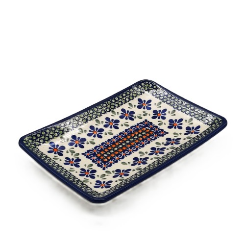 Taca na sushi o wymiarach 21,8x 15 cm, wykonana z ceramiki Bolesławiec, ozdobiona subtelnym motywem kwiatowym oraz geometrycznym. Ręcznie zdobiona, charakteryzuje się klasycznym wzornictwem, które łączy polską tradycję z delikatnym, orientalnym akcentem idealnym do serwowania sushi i innych przekąsek. Solidne wykonanie oraz piękne wykończenie sprawiają, że jest to zarówno funkcjonalny, jak i dekoracyjny element zastawy stołowej.
