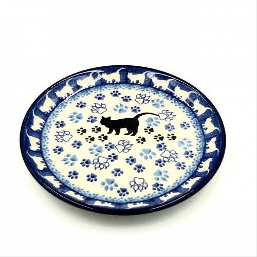 - Wokół kota mogą znajdować się dodatkowe motywy, takie jak kocie łapki w odcieniach koloru niebieskiego, które nadają talerzykowi jeszcze więcej uroku.