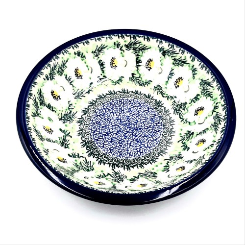 Głęboki talerz o pojemności 0,5 litra z ceramiki Bolesławiec, to wyjątkowy element ceramiki artystycznej, który łączy tradycyjne wzornictwo z funkcjonalnością. Wzór ten charakteryzuje się klasycznym, ręcznie malowanym motywem białych kwiatów na tle w odcieniach niebieskiego i zielonego. Dekoracja jest typowa dla tradycji bolesławieckiej, utrzymana w spokojnej, harmonijnej kolorystyce, co czyni ją uniwersalną i elegancką.