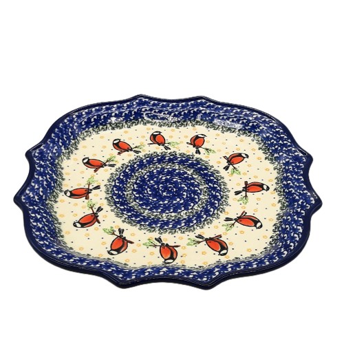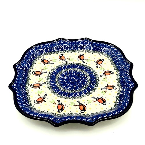 Ten talerz ma wzór w odcieniach niebieskiego koloru oraz posiada motyw ptaków w odcieniach czerwieni . Jest wykonany z kamionki, posiada nieregularny kształt i ma wymiary 26,5 x 26,5 cm. Talerz jest idealny do serwowania ciasta, ciasteczek lub innych przekąsek.