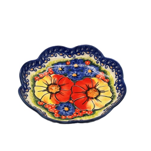 Talerz kwiatek o średnicy 16,0 cm z motywem kwiatowym  z ceramiki Bolesławiec to prawdziwa perełka dla miłośników pięknych przedmiotów i wysokiej jakości rzemiosła. Ceramika Bolesławiec słynie z swojej trwałości, wyjątkowego wzornictwa oraz charakterystycznych, kolorowych dekoracji. Talerz taki z pewnością będzie ozdobą każdego stołu.