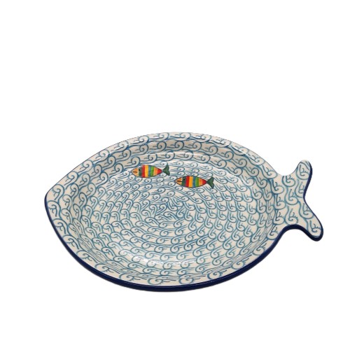 Talerz w kształcie ryby z motywem rybek – klasyka ceramiki bolesławieckiej