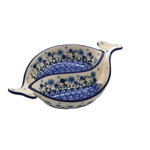 Talerz ryba o wymiarach 23/15 cm, h:5 cm to uroczy dodatek do każdej zastawy stołowej, produkowany przez Spółdzielnię Rękodzieła Artystycznego w Bolesławcu. Charakterystyczny wzór z motywem roślinnym nadaje mu wyjątkowego uroku i wprowadza do wnętrza nutę przyrody.
