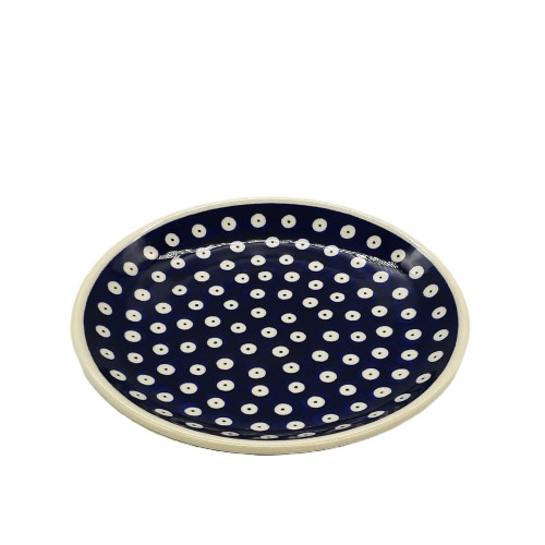Talerz deserowy o średnicy 19,5 cm to uroczy dodatek do każdej zastawy stołowej, produkowany przez Zakłady Ceramiczne w Bolesławcu. Charakterystyczny wzór w pawie oczka nadaje mu wyjątkowego uroku.