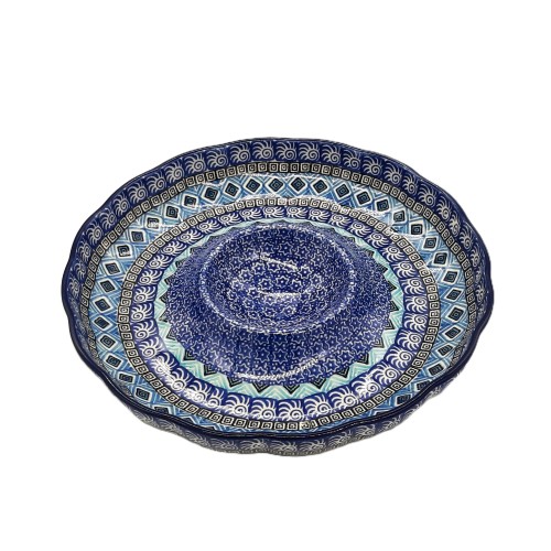 Talerz na frytki z ceramiki bolesławieckiej, ręcznie malowany przez Spółdzielnię Rękodzieła Artystycznego Bolesławiec. Posiada centralne miejsce na sos.